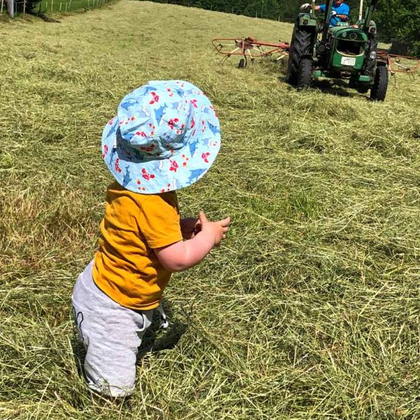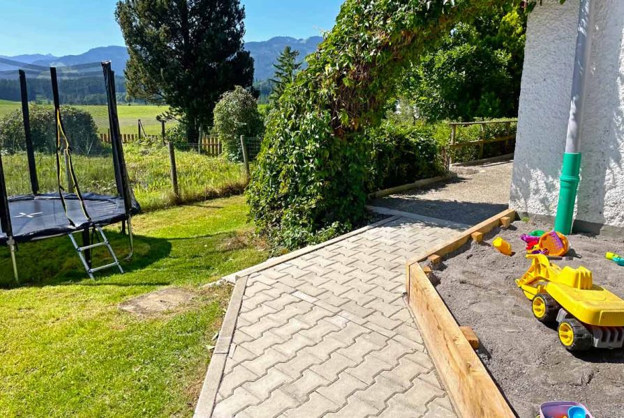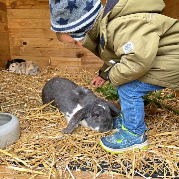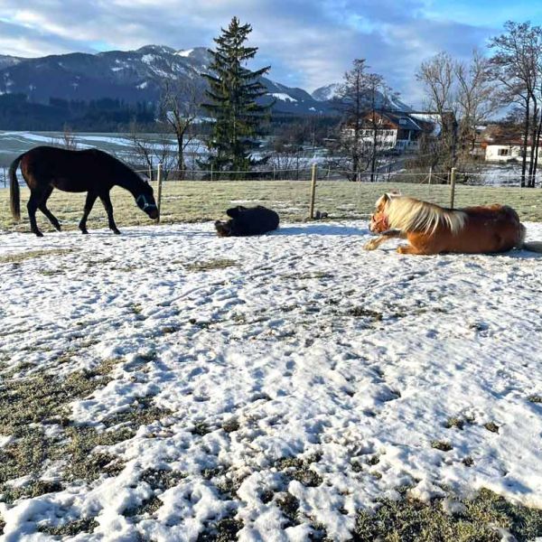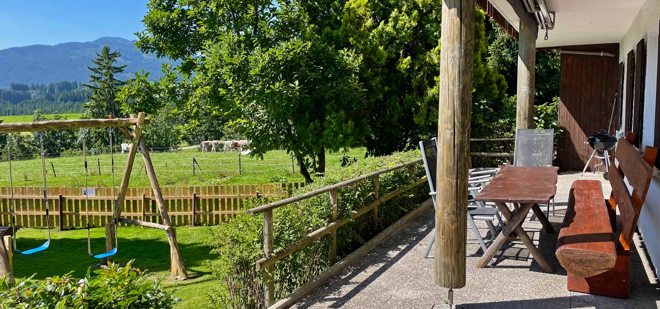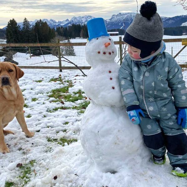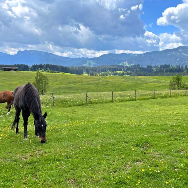 Kinder dürfen bei uns noch Kind sein – ob beim Füttern von Zwergziegen, Hasen und Hühnern, beim Streicheln unserer Katzen oder beim Beobachten der Ponys, Pferde und Jungtiere auf der Weide. Ein eingezäunter Spielplatz mit Rutsche, Schaukel, Trampolin und Sandkasten sowie Tretfahrzeuge wie Kettcar, Bobbycar oder Trettraktor sorgen für sicheren Spielspaß direkt am Hof. Während die Kleinen die Freiheit genießen, entspannen Sie auf der Terrasse – mit Blick auf die Allgäuer Alpen und das herrliche Panorama. Ein Urlaub, wie ihn Kinder lieben – und Eltern genießen!