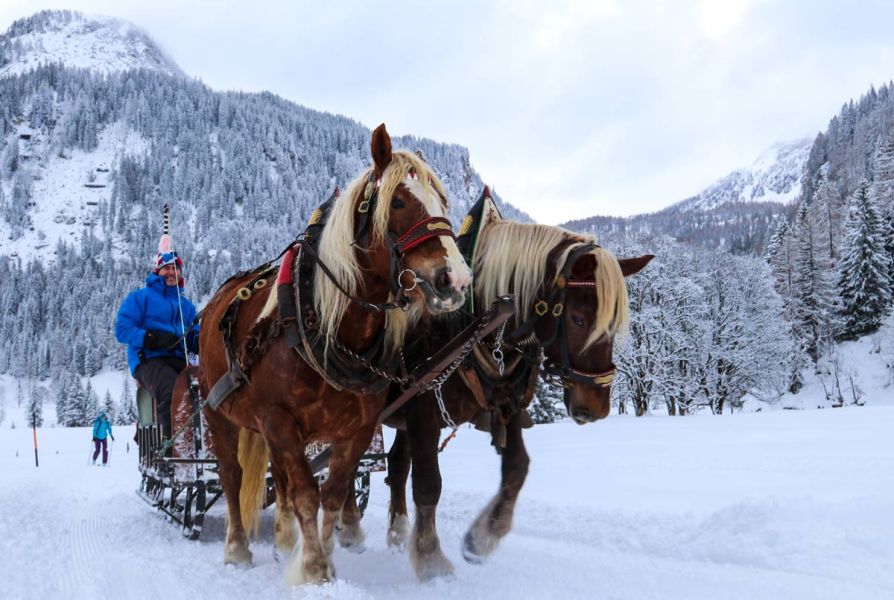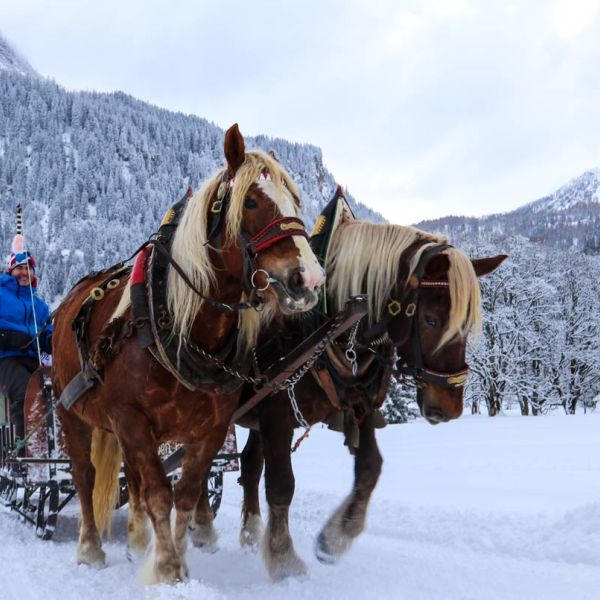 Romantische Schlittenfahrt durch verschneite Landschaft – ideal für Familien. -